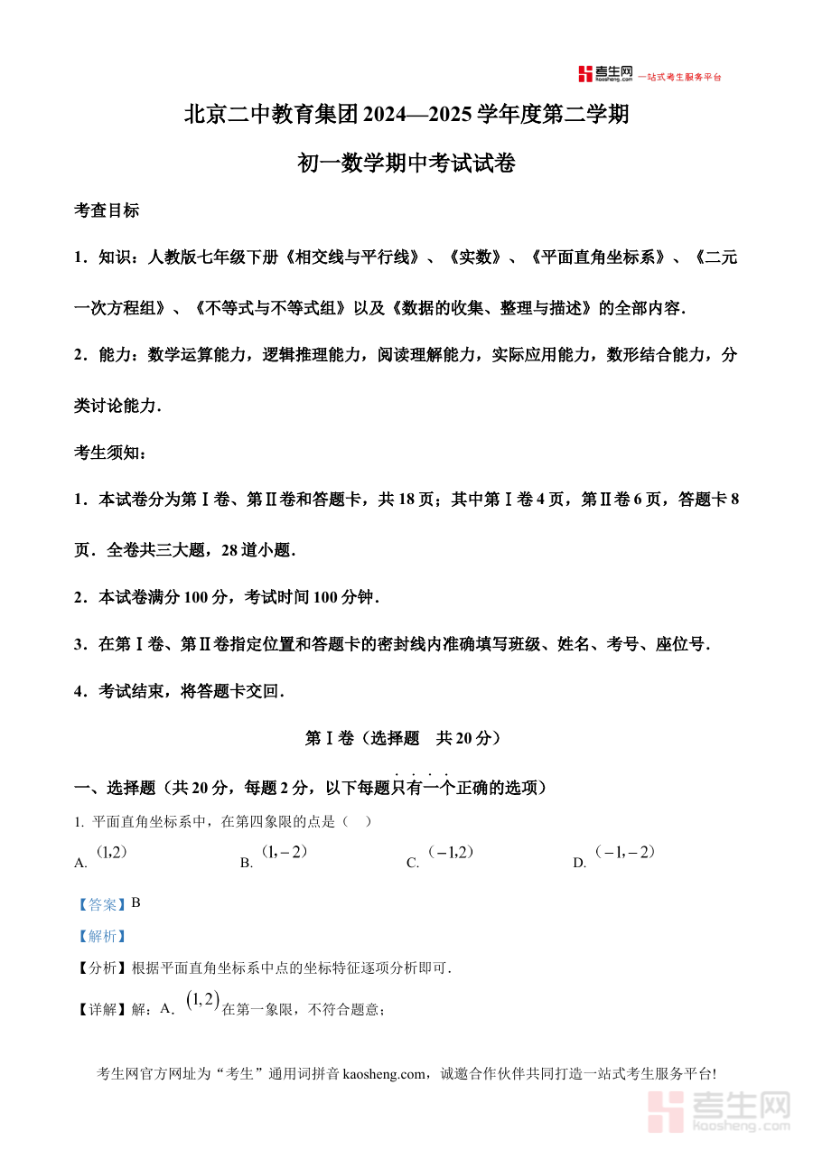 《精品解析:北京二中教育集团2024—2025学年下学期七年级数学期中考试试卷(解析版)》是针对北京二中教育集团2024至2025学年下学期七年级数学期中考试的专项备考资料,精准贴合该集团的教学进度与期中检测标准,为相关使用者提供与考试直接相关的参考内容。