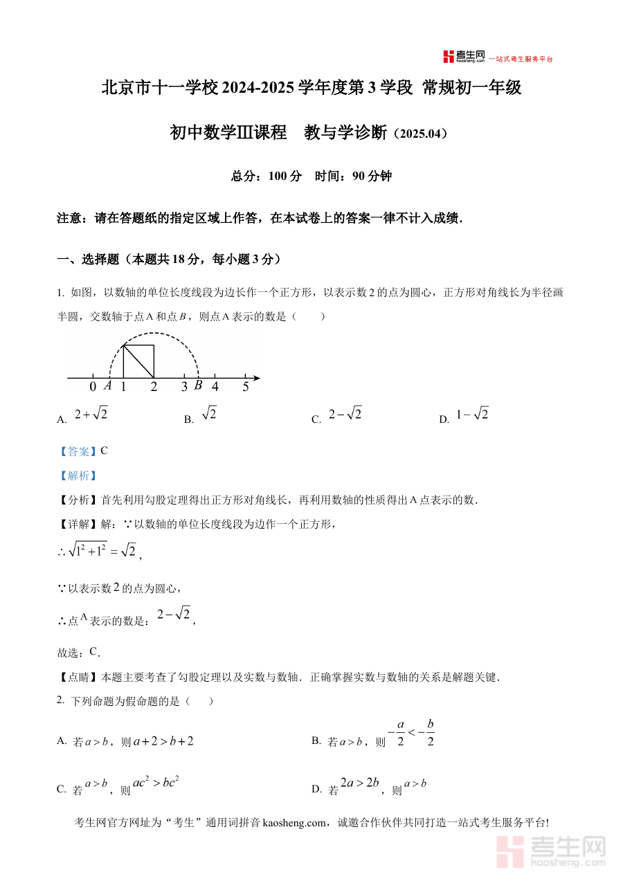 《精品解析:北京市十一学校2024-2025学年 第3学段常规七年级级初中数学(III)课程 教与学诊断(解析版)》是北京市十一学校在2024-2025学年第三学段推出的针对常规七年级初中数学(III)课程的教与学诊断解析类资料,属于该阶段数学课程学习的重要备考辅助材料,能够为师生提供该学段数学学习情况的专业参考依据。