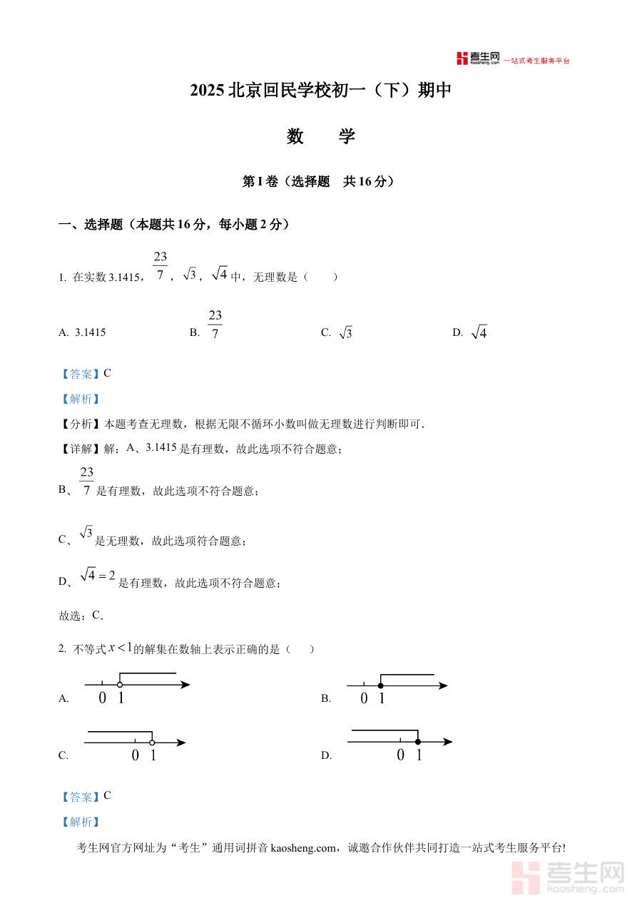《精品解析:北京市回民学校2024-2025学年七年级下学期期中考试数学试卷(解析版)》是针对北京市回民学校特定学年学期数学期中考试的配套备考资料。该资料聚焦2024-2025学年七年级下学期的期中阶段,紧密贴合该校数学学科的期中考查需求,为使用者提供与本次考试直接相关的解析内容,是了解该次期中考试数学学科考查方向和要求的重要资源,有助于使用者提前熟悉考试的整体框架与核心指向。