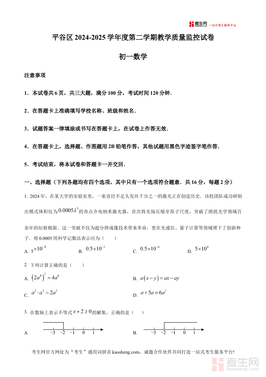 本资料主要适用于北京市平谷区该学年下学期的七年级数学学习者,以及从事相关教学工作的教师,通过原卷形式的呈现,助力学生熟悉考试形式与要求,辅助教师优化教学策略,提升阶段检测与备考规划的针对性和有效性。