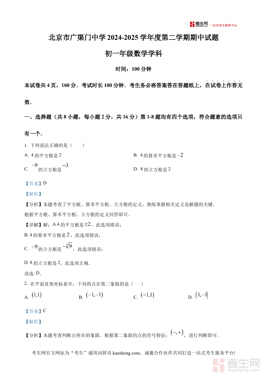 《精品解析:北京市广渠门中学2024-2025学年下学期期中考试七年级数学试题(解析版)》是针对北京市广渠门中学2024至2025学年下学期七年级数学期中考试的专项备考资料,精准对接该校该阶段数学学科的期中检测场景,为使用者提供与校内考试高度匹配的解析内容。