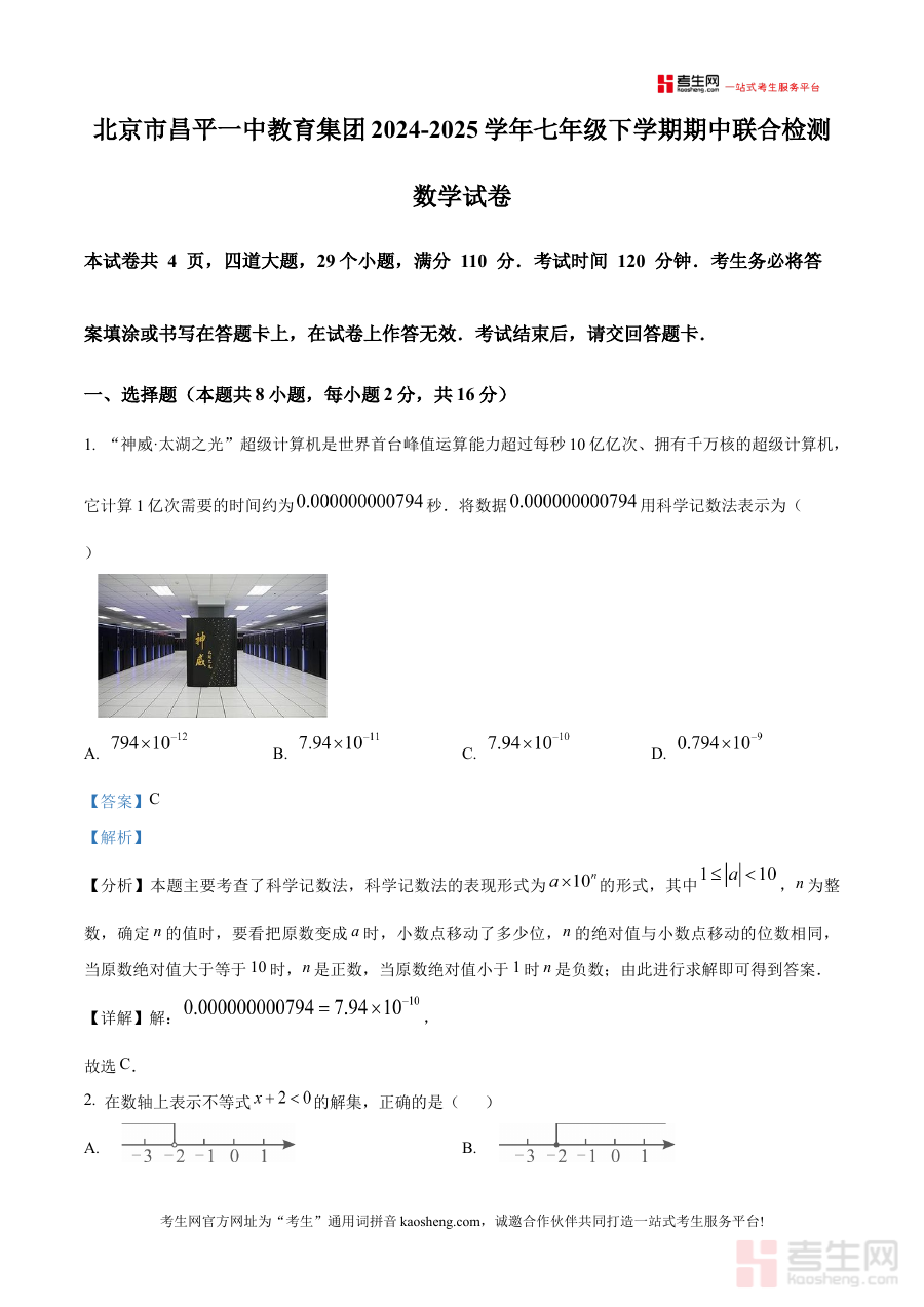 本资料适用于北京市昌平一中教育集团七年级下学期学生及相关学科教师,作为期中阶段检测的重要辅助材料,其解析内容不仅有助于学生巩固所学知识、提升解题能力,也为教师开展教学评估与个性化指导提供实用的参考依据。
