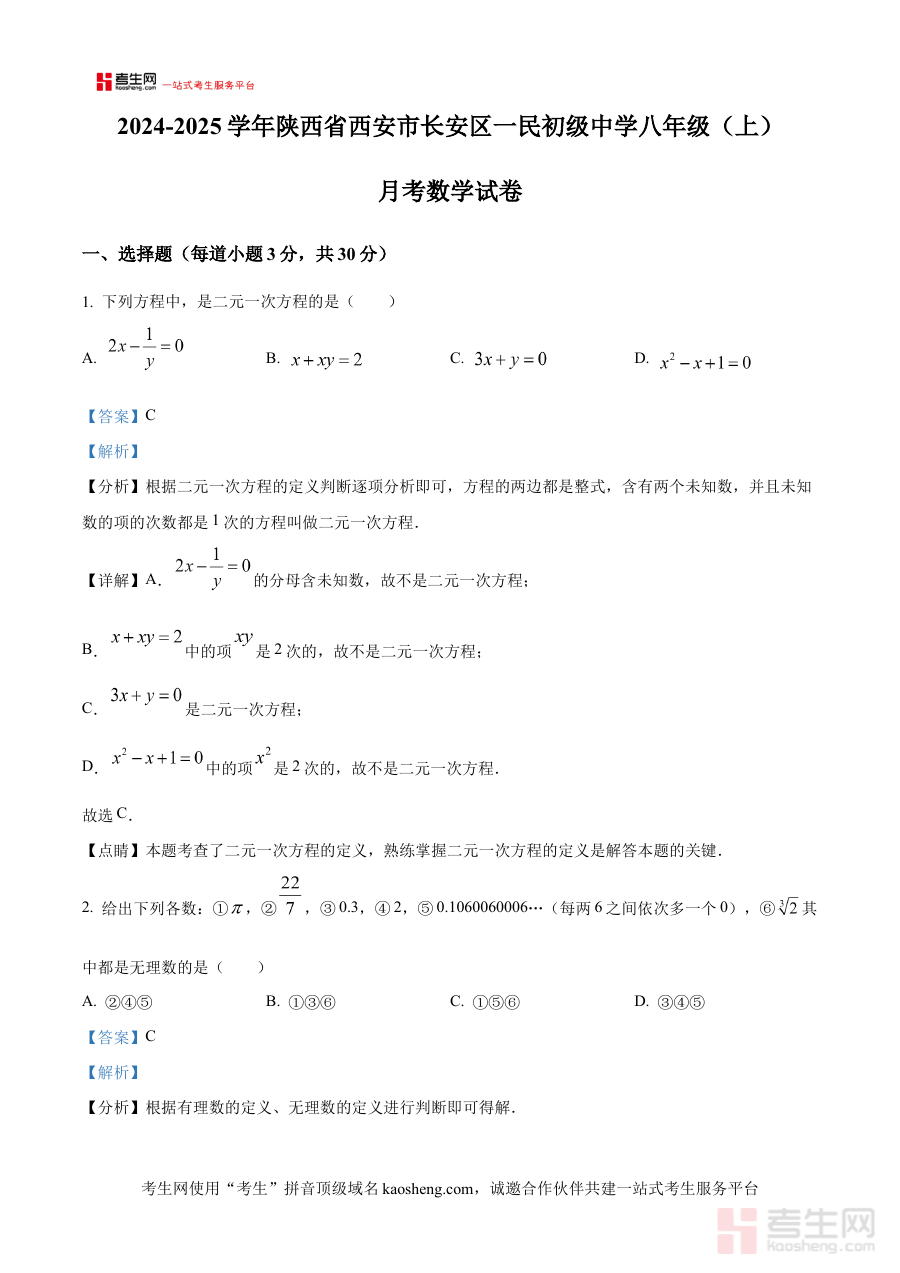 《精品解析:陕西省西安市长安区一民初级中学2024-2025学年上学期八年级月考数学试卷(解析版)》是针对陕西省西安市长安区一民初级中学在2024至2025学年第一学期组织的八年级数学月考所开发的专业化备考资料。该资料紧密结合学校当学期八年级数学的教学进度与月考的考查方向,为使用者提供与本校实际考试场景高度贴合的内容支持,有助于提前熟悉本校月考的命题逻辑、考查重点及评分标准,是适配该阶段学生学习需求与教师教学辅助需求的针对性资料。