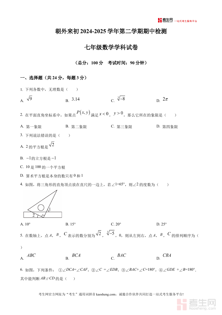 《精品解析:北京市朝阳区朝阳外国语学校(朝外来初)2024-2025下学期七年级数学期中考试试卷(原卷版)》是针对北京市朝阳区朝阳外国语学校朝外来初2024-2025学年下学期七年级数学期中考试的备考资料,聚焦该阶段数学学科的期中检测需求,为使用者提供贴合校考实际的原卷内容参考。