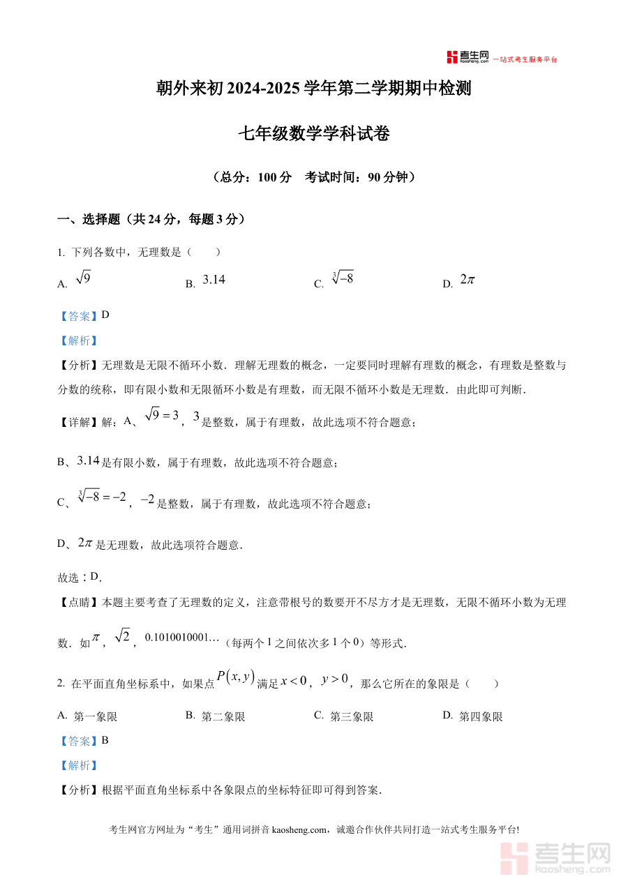 《精品解析:北京市朝阳区朝阳外国语学校(朝外来初)2024-2025下学期七年级数学期中考试试卷(解析版)》是针对北京市朝阳区朝阳外国语学校2024-2025学年下学期七年级数学期中考试的配套解析资料,聚焦该地区特定学校的阶段考试需求,为相关师生提供精准的备考参考依据。