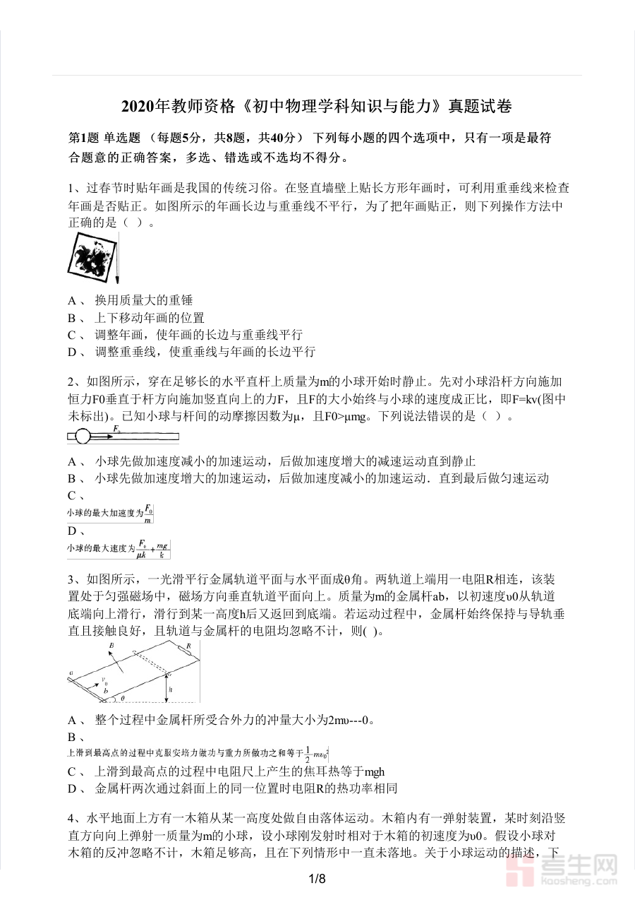 《2020年下半年教师资格证考试《初中物理》题》是针对2020年下半年全国教师资格证考试初中物理学科的专业备考资料,作为教师资格证考试备考体系中的重要组成部分,它严格遵循初中物理学科的考试大纲要求,紧密贴合该时段考试的命题方向与考查标准,为考生提供了与实际考试场景高度匹配的练习载体,助力考生提前适应考试节奏并把握核心考查脉络。