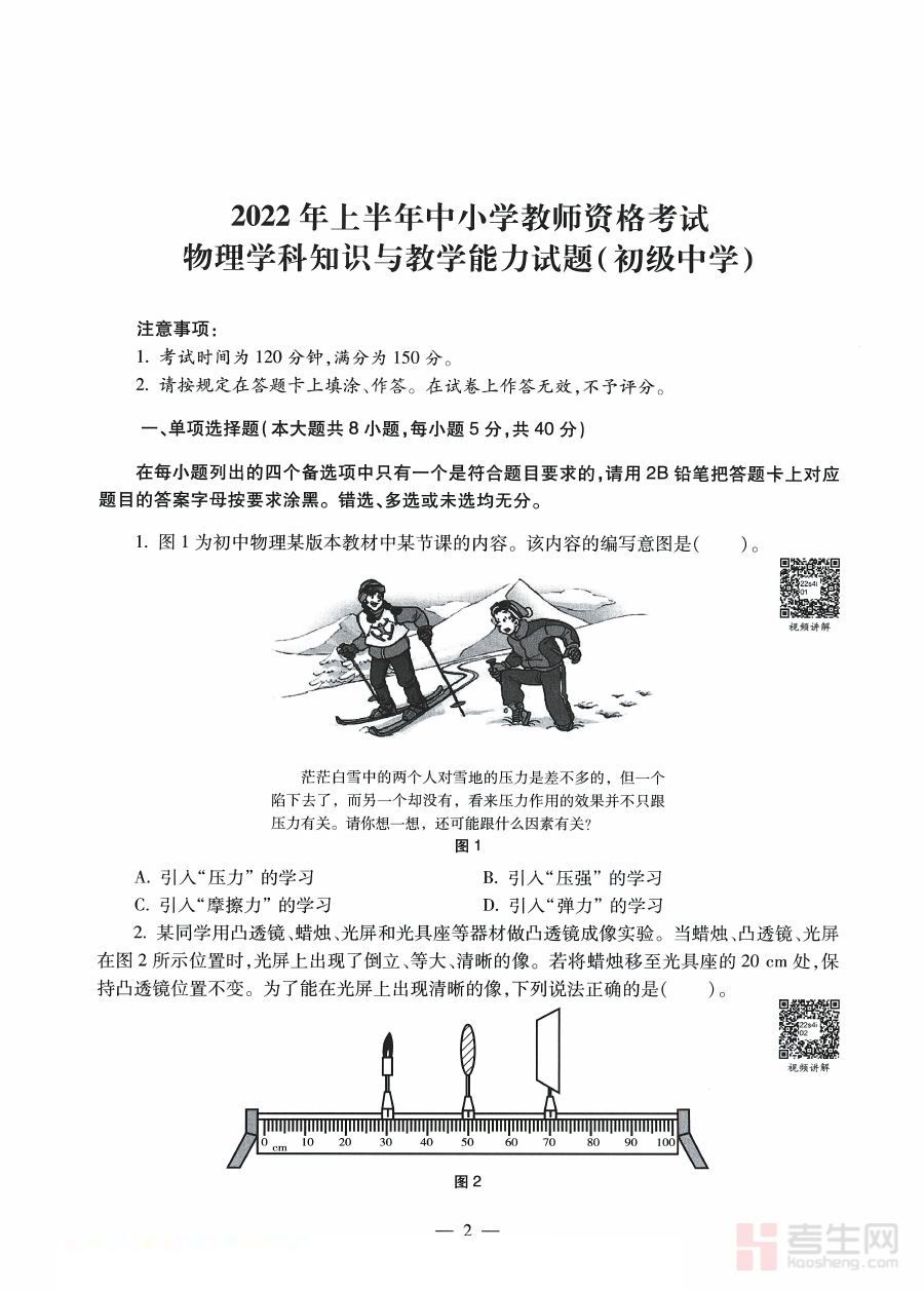 《2022年上半年教师资格证考试《初中物理》题》是对应2022年上半年全国教师资格证初中物理学科考试的备考资料,该考试是我国教师资格准入体系中的重要组成部分,旨在评估考生是否具备初中物理学科教学所需的专业知识储备与教学实践能力,是考生获取初中物理教师资格的核心考核依据。