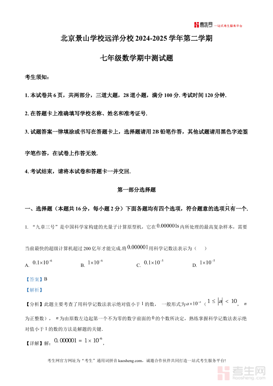 本资料适用于北京市石景山区景山远洋分校七年级学生、数学教师及相关家长群体,其解析内容能有效支持学生进行期中备考的系统性规划,为教师的教学评估与家长的学情跟踪提供专业参考,助力提升阶段学习质量与备考效率。