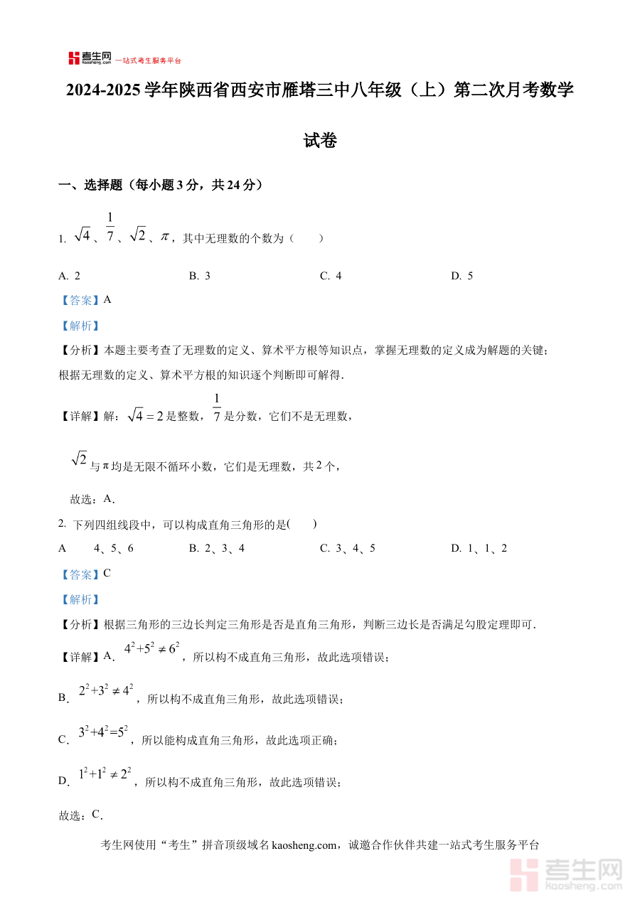 《精品解析:陕西省西安市雁塔区第三中学2024-2025学年八年级上学期第二次月考数学试卷(解析版)》是一份针对特定学校特定学年特定阶段的数学学科备考资料它精准覆盖陕西省西安市雁塔区第三中学在2024至2025学年八年级上学期组织的第二次月考场景不仅贴合该校该阶段数学教学的进度与要求还为相关师生提供了与校内考试高度匹配的复习参考依据是衔接日常学习与阶段性检测的重要辅助材料