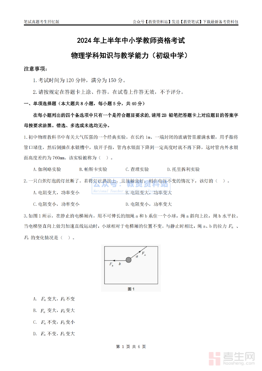《2024上半年初中《物理》真题》是2024年上半年初中物理相关考试的原题汇编,作为初中物理备考体系中的关键资料,其内容直接体现该阶段物理学科的考查目标与命题特点,为师生提供了了解考试实际要求的权威参考依据。