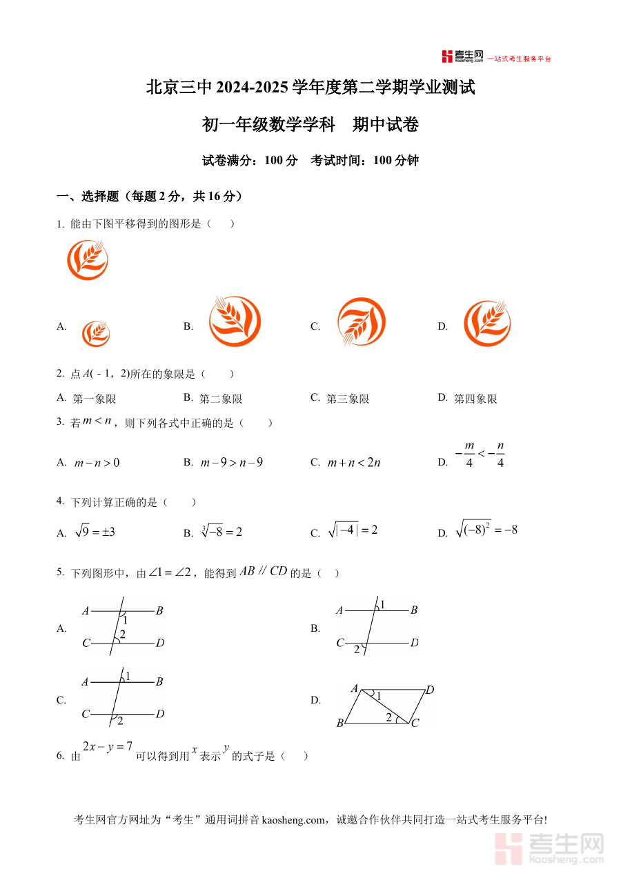《精品解析:北京市第三中学 2024-2025学年七年级下学期数学期中试卷 (原卷版)》是针对北京市第三中学2024-2025学年七年级下学期数学期中考试设计的专业备考资料。该资料以原卷版形式呈现,精准匹配学校期中检测的时间节点与命题范围,能够帮助使用者直接接触考试的原始形态,提前熟悉考试的整体结构与命题风格,为后续的备考工作奠定坚实基础。