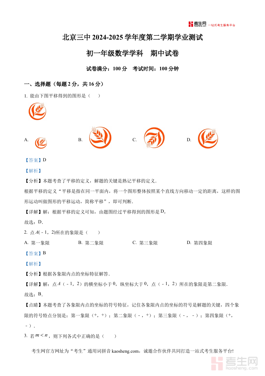 《精品解析:北京市第三中学 2024-2025学年七年级下学期数学期中试卷 (解析版)》是针对北京市第三中学2024至2025学年七年级下学期数学期中考试推出的备考资料,紧密贴合该学年该阶段的数学学习进度与学校期中检测的具体要求,为使用者提供与实际考试高度匹配的内容支持。它整合了对应学期中期数学学习的核心考查方向,是学生备战期中、教师开展教学辅助的重要资源。