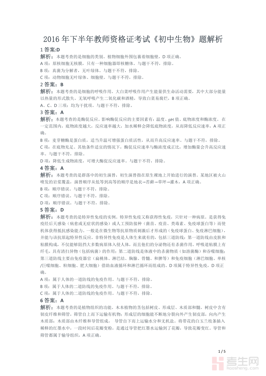 《2016年下半年教师资格证考试《初中生物》题(解析)》是2016年下半年针对初中生物学科教师资格证考试的专业备考资料,依托该年度下半年的考试命题方向与要求,为考生提供贴合真实考试场景的真题素材及对应的详细解析内容,是考生接触考试形式、熟悉命题特点的重要学习资源。