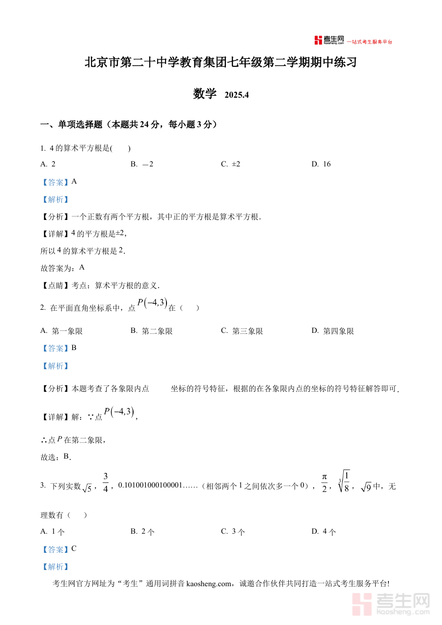 《精品解析:北京市第二十中学教育集团2024—2025学年下学期七年级期中练习 数学试题(解析版)》是针对北京市第二十中学教育集团2024至2025学年下学期七年级数学期中练习的专业解析类备考资料,聚焦该阶段数学学科的期中检测需求,为使用者提供与集团内部期中练习配套的系统解析内容。