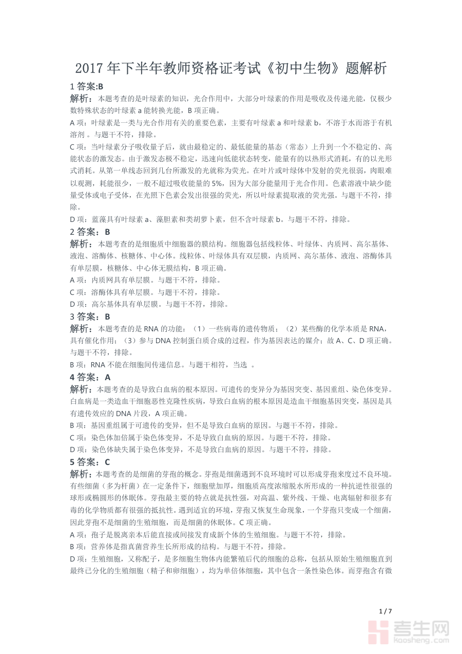 《2017年下半年教师资格证考试《初中生物》题(解析)》是针对2017年下半年全国教师资格证考试初中生物学科的专业备考资料,紧密贴合该年度该学科教师资格认证考试的命题背景与考察需求,为备考者提供了与考试直接相关的题目及配套解析内容。作为特定时间段内的考试资料,其内容与当年初中生物教师资格考试的实际要求相匹配,能够帮助备考者快速把握考试的核心方向和考察重点,为后续的系统复习奠定基础。