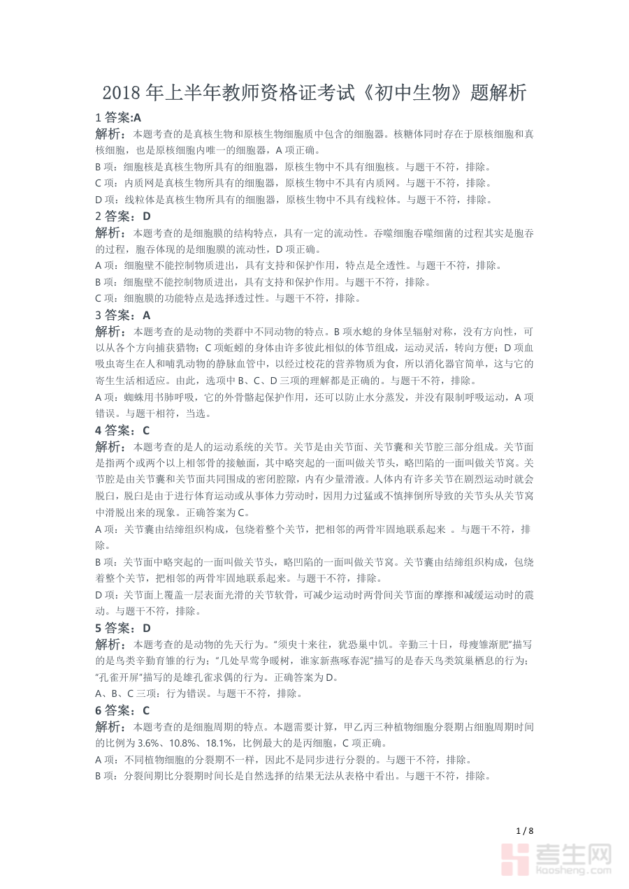 《2018年上半年教师资格证考试《初中生物》题(解析)》是2018年上半年针对初中生物学科教师资格证考试的专业备考资料,包含该次考试的完整试题及对应的详细解析内容。作为教师资格证考试的核心备考资源之一,它能够为备考者还原该次考试的真实命题场景,帮助备考者准确把握考试的考查方向与内容架构,为后续开展针对性复习提供清晰的参考依据。