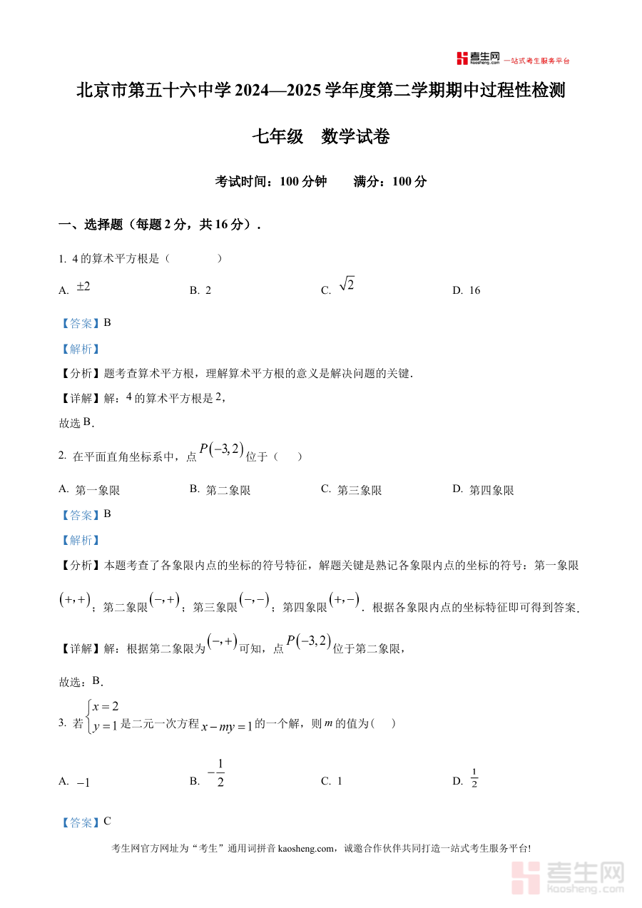 《精品解析:北京市第五十六中学2024-2025学年七年级下学期数学期中试卷(解析版)》是针对北京市第五十六中学2024至2025学年七年级下学期数学学科期中检测的专业配套解析资料,其依托该校该学年段的期中试卷内容进行系统解读,紧密贴合该学校七年级下学期数学学科的教学进度与期中检测要求,旨在为相关使用者提供与该次期中检测直接关联的学习支持与备考辅助。