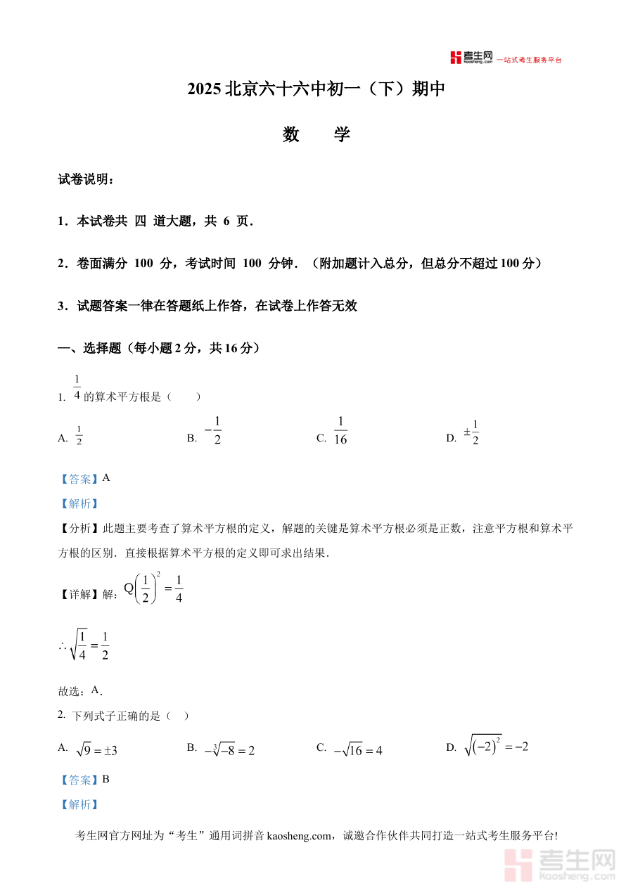 《精品解析:北京市第六十六中学2024—2025学年下学期七年级期中考试数学试题(解析版)》是针对北京市第六十六中学2024至2025学年下学期七年级数学期中考试的专项备考资料。该资料聚焦特定学校特定学期的期中检测场景,精准匹配七年级下学期数学学科的阶段学习内容与考试要求,为使用者提供与实际考试直接相关的专业解析支持。