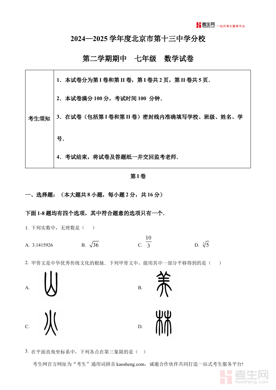 《精品解析:北京市第十三中学分校2024—2025学年下学期七年级期中数学试卷(原卷版)》是针对北京市第十三中学分校2024至2025学年下学期七年级期中数学考试的专项备考资料,聚焦该阶段数学学科的期中检测需求,为使用者提供与实际考试场景匹配的原卷内容。