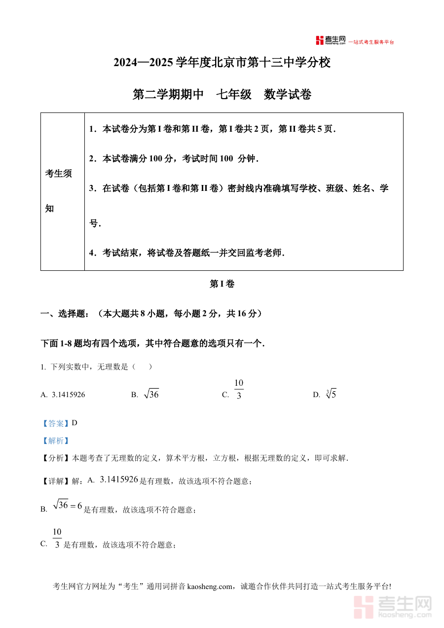 《精品解析:北京市第十三中学分校2024—2025学年下学期七年级期中数学试卷(解析版)》是针对北京市第十三中学分校2024至2025学年下学期七年级期中数学考试的专项备考资料,紧密贴合该阶段数学学科的教学进度与考试要求,为相关使用者提供具有针对性的复习与教学支持。