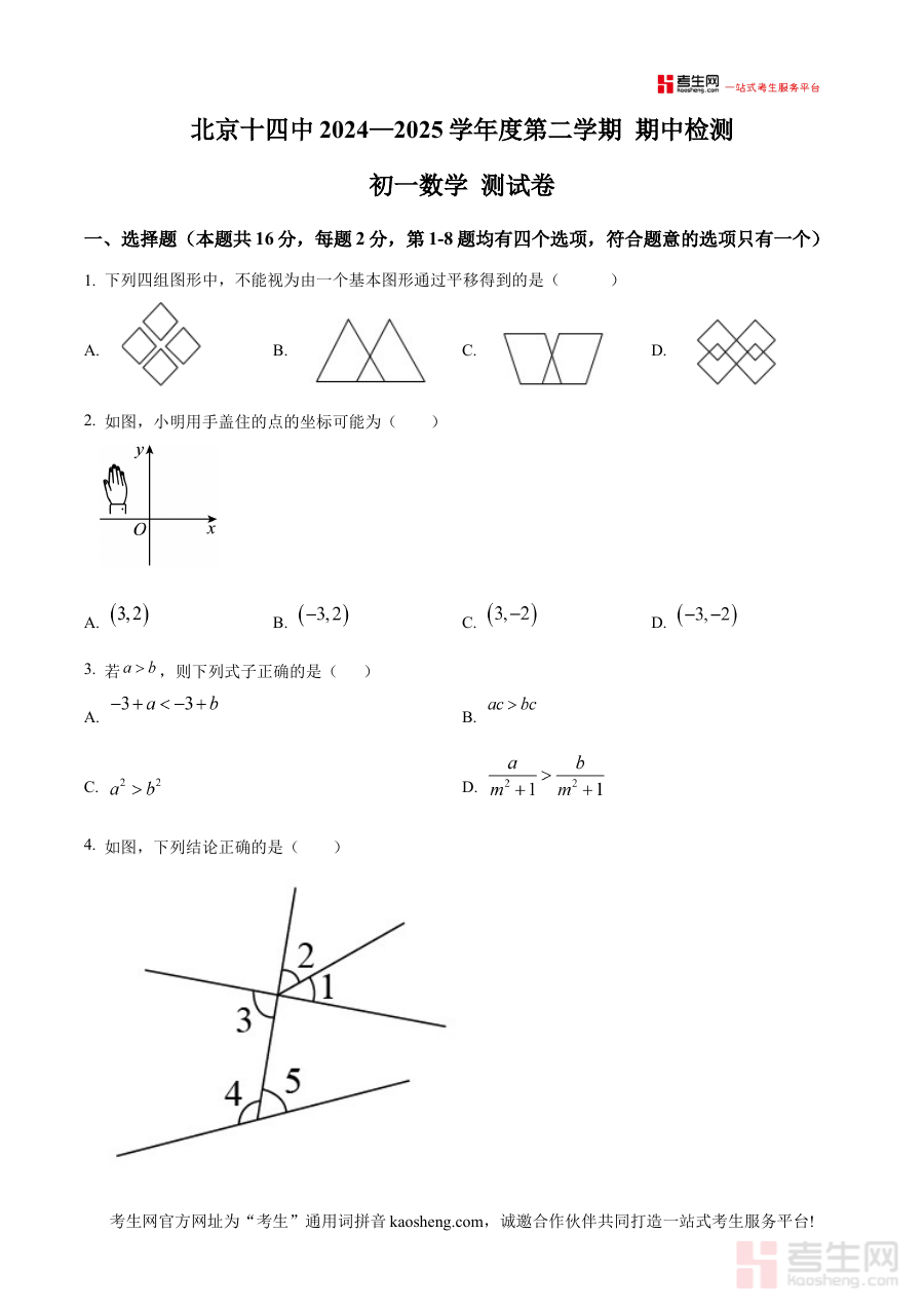 《精品解析:北京市第十四中学2024—2025学年下学期期中检测七年级数学测试卷(原卷版)》是针对北京市第十四中学2024至2025学年下学期七年级数学期中检测设计的备考资料,聚焦该阶段学校内部的期中检测场景,为学生提供贴合本校教学进度与考试要求的练习载体。