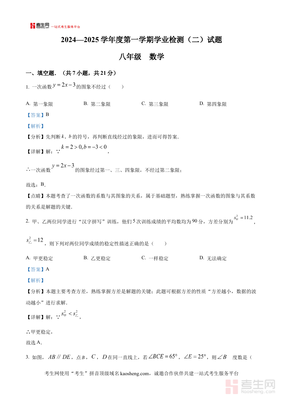 《精品解析:陕西省西安高新第一中学2024-2025学年上学期第二次月考八年级数学试题(解析版)》是针对陕西省西安高新第一中学特定学年学期、特定年级科目及特定考试阶段的专业备考辅助资料。该资料聚焦2024-2025学年上学期八年级数学第二次月考这一具体考试场景,依托西安高新第一中学的月考命题背景,为使用者提供与该次考试直接关联的解析支持,是贴合该阶段数学学习进度与考试要求的针对性材料。