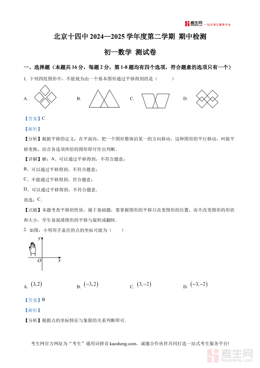 《精品解析:北京市第十四中学2024—2025学年下学期期中检测七年级数学测试卷(解析版)》是针对2024—2025学年下学期北京市第十四中学七年级数学期中检测的专业备考资料,结合该阶段教学进度与期中检测的核心需求,为使用者提供精准的内容支持。