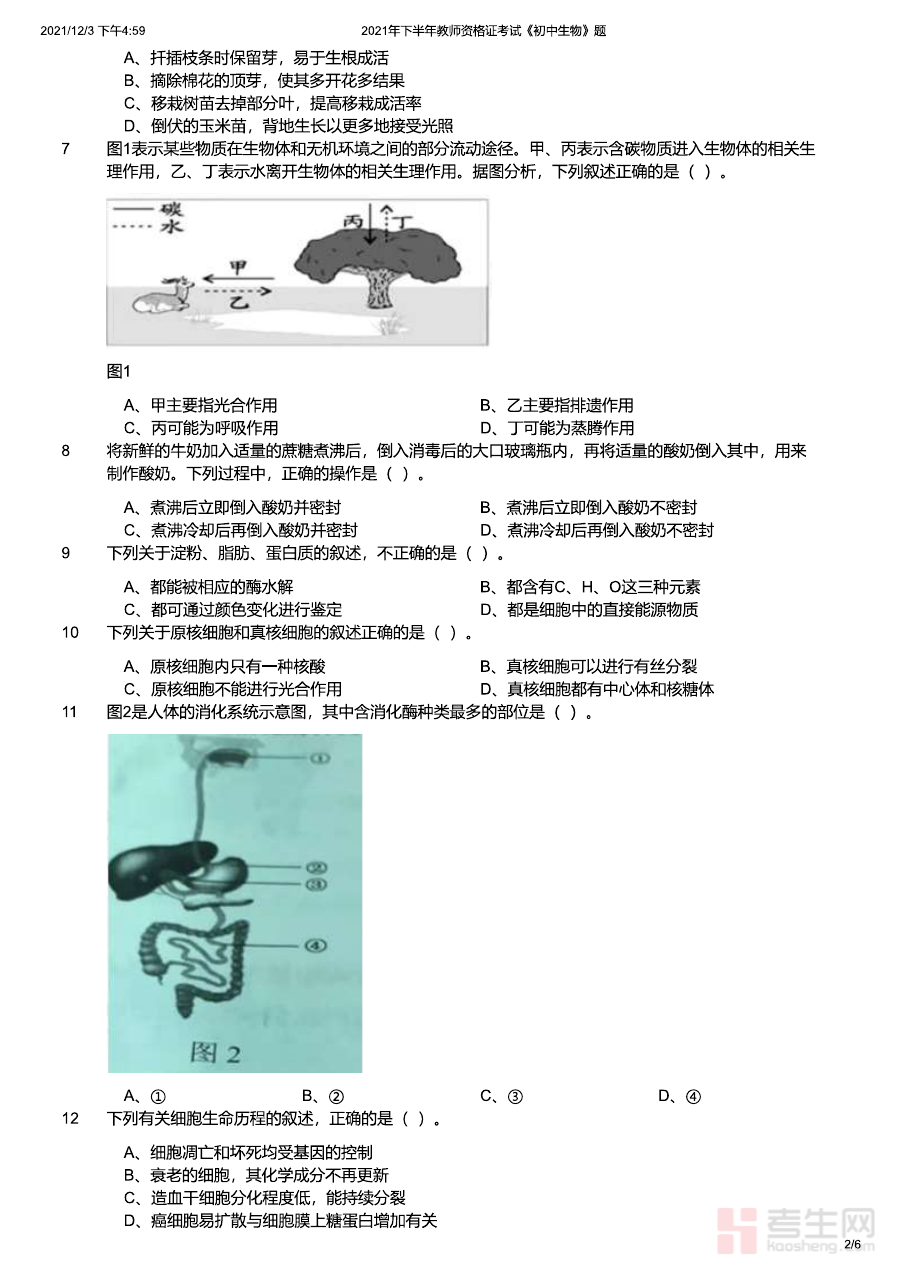 《2021年下半年教师资格证考试《初中生物》题》是针对2021年下半年全国教师资格证考试初中生物学科的专项备考资料,紧密贴合该次考试的时间节点与学科考查定位,为考生提供与考试实际要求相匹配的练习素材,帮助考生初步熟悉考试的整体框架与初中生物学科的考查方向,是备考过程中不可或缺的辅助资源之一。