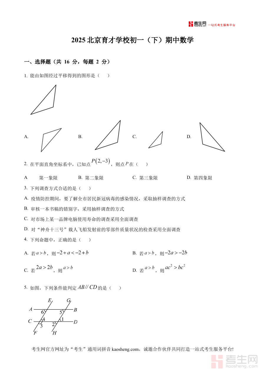 《精品解析:北京市育才学校2024-2025学年七年级下学期期中数学试题(原卷版)》是北京市育才学校在2024-2025学年针对七年级下学期学生组织的期中数学考试原卷资料,属于该阶段数学学科的核心备考资源。它直接关联该校该学年七年级下学期期中数学考试的命题背景与考查框架,为使用者提供贴近实际考试场景的参考依据。