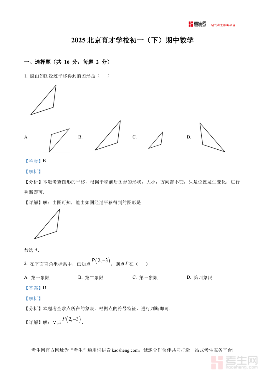 《精品解析:北京市育才学校2024-2025学年七年级下学期期中数学试题(解析版)》是针对北京市育才学校2024至2025学年七年级下学期数学期中检测的专项备考资料,聚焦该阶段数学学科的期中考查需求,依托学校官方期中试题资源,通过专业解析为使用者提供精准的备考支持,帮助使用者快速把握期中考查的核心方向与重点内容。