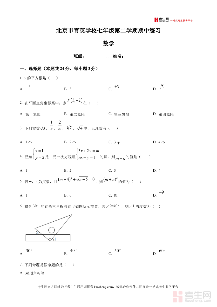 《精品解析:北京市育英学校2024-2025学年七年级下学期期中数学试卷(原卷版)》是北京市育英学校在2024至2025学年针对七年级下学期期中数学考试推出的原卷版备考资料,涵盖该学校该阶段数学学科阶段性考试的核心考查载体形式,为使用者提供与实际考试一致的试卷呈现方式和考查方向参考,是了解该学校七年级下学期数学期中测试体系的重要资源。