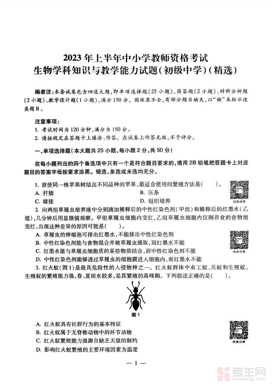 《2023年上半年教师资格证考试《初中生物》题》是针对2023年上半年全国教师资格证考试初中生物科目的专业备考资料。该资料依托教师资格证考试的官方考核框架,聚焦初中生物学科的核心考查内容,为考生提供符合考试要求的题目资源。作为备考过程中的关键辅助材料,它能够帮助考生初步把握初中生物教师资格考试的题型特点与命题方向,为后续的系统复习奠定基础。