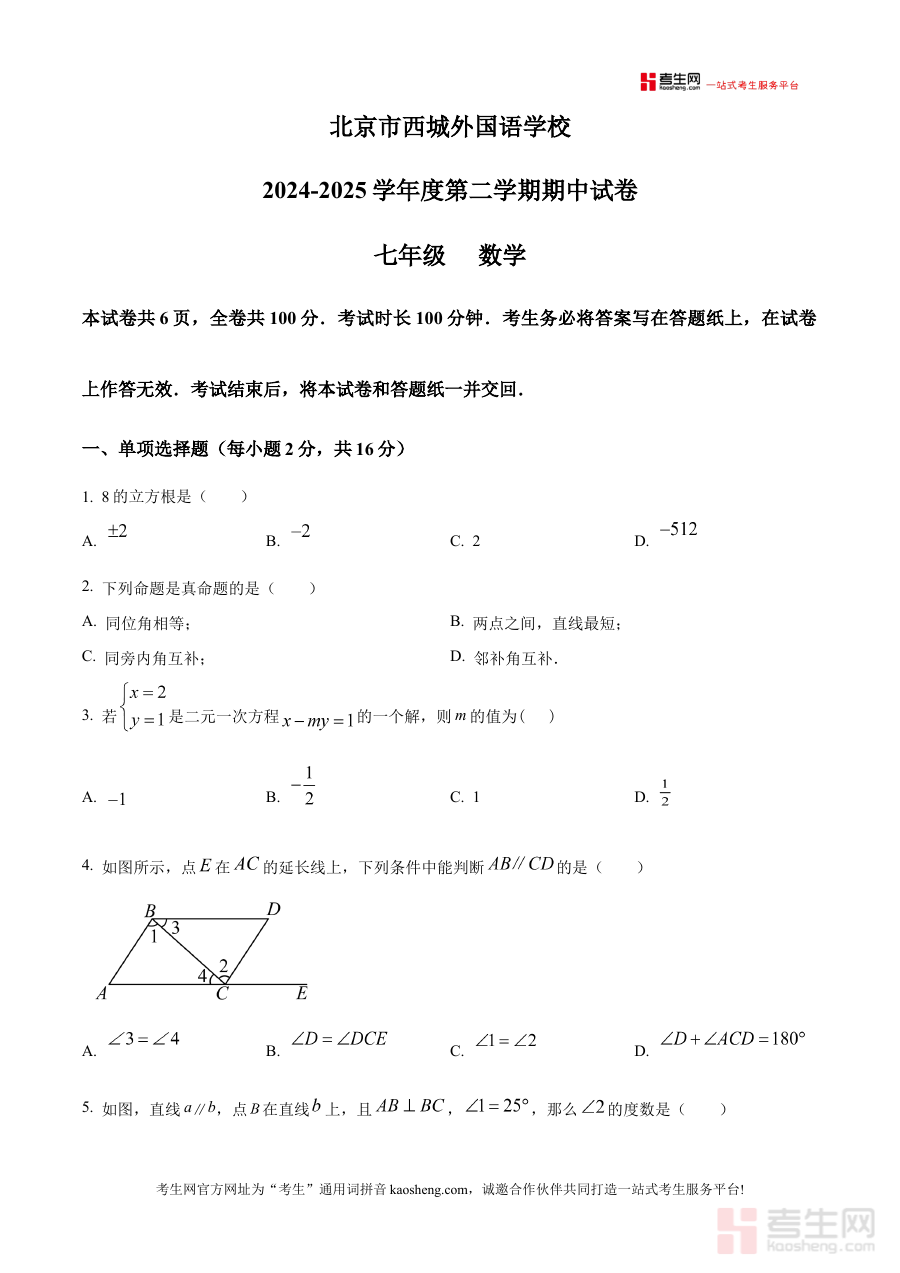 《精品解析:北京市西城外国语学校2024-2025学年七年级下学期期中数学试题(原卷版)》是针对北京市西城外国语学校2024至2025学年七年级下学期期中数学考试的备考资料,包含该阶段数学学科期中检测的相关内容,能够为学生提供贴合本校教学进度与考试要求的练习素材。