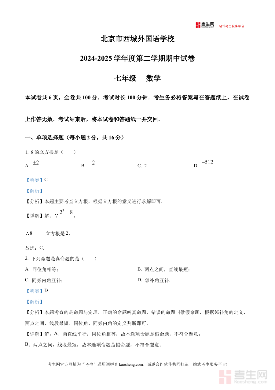 《精品解析:北京市西城外国语学校2024-2025学年七年级下学期期中数学试题(解析版)》是针对北京市西城外国语学校2024至2025学年七年级下学期期中数学考试的专业备考资料,聚焦该特定学年段与考试节点的数学学科需求,为相关使用者提供精准适配的内容支持。