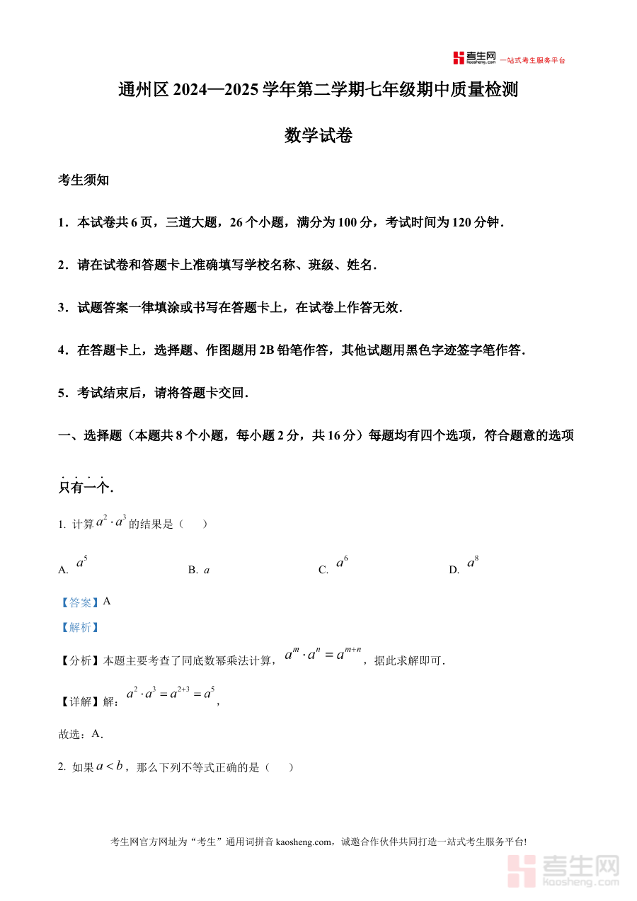 《精品解析:北京市通州区2024-2025学年下学期七年级期中质量检测数学试题(解析版)》聚焦北京市通州区2024至2025学年下学期七年级的期中质量检测数学学科内容,是针对该区域该学段期中数学考试的专业备考资料,能够为使用者提供与本地考试方向高度契合的参考依据,助力使用者更精准地把握考试的核心要求与考查重点,为后续学习或教学规划提供清晰的方向指引。