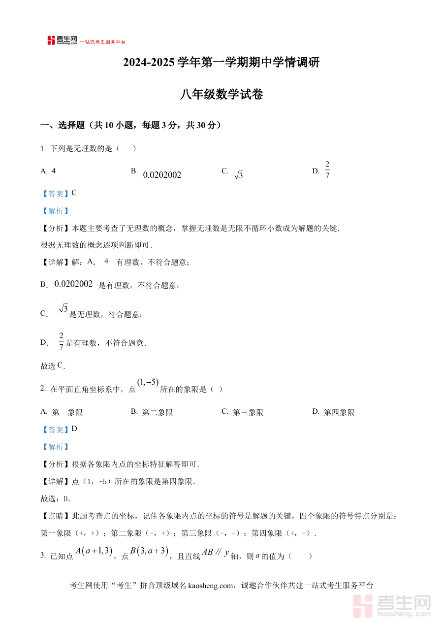 《精品解析:陕西省西安市经开第一学校2024-2025学年上学期八年级期中数学试题(解析版)》是面向陕西省西安市经开第一学校特定学年学期的数学学科阶段性考试资料,精准对应该校八年级上学期期中数学考试的考查需求,为相关师生提供了与本次考试直接关联的备考支持材料。作为解析版资源,它不仅包含试题本身,还附带对试题的专业解析,能够帮助使用者深入理解考试内容与考查方向,是针对性极强的期中备考工具。