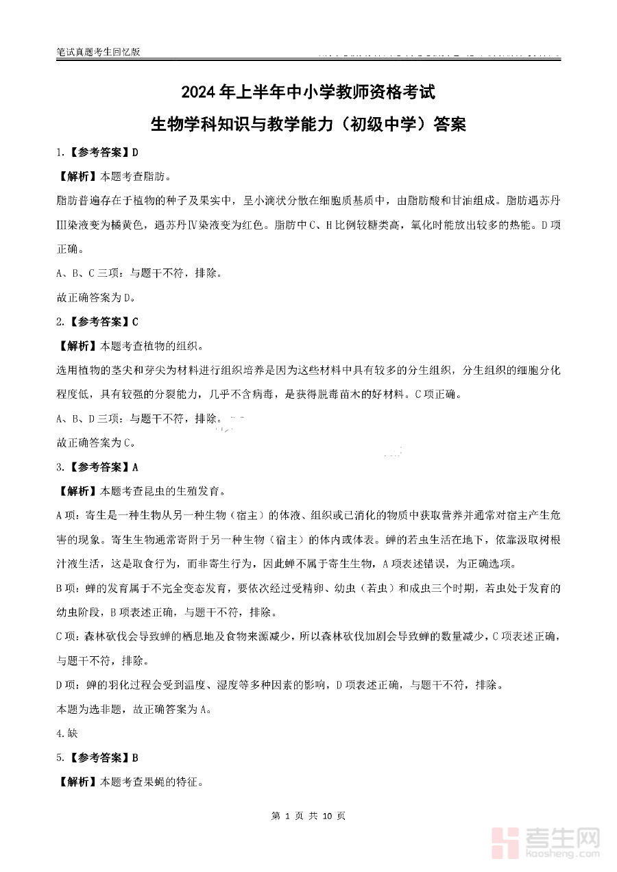 《2024年上半年《初中生物》答案及解析》是针对2024年上半年初中生物学习与评估场景的配套备考资料,明确承载着该时间段内初中生物学科的阶段性学习验证功能,为使用者提供与当前学习进度相匹配的参考依据,帮助其把握初中生物学习的核心方向与评估标准。