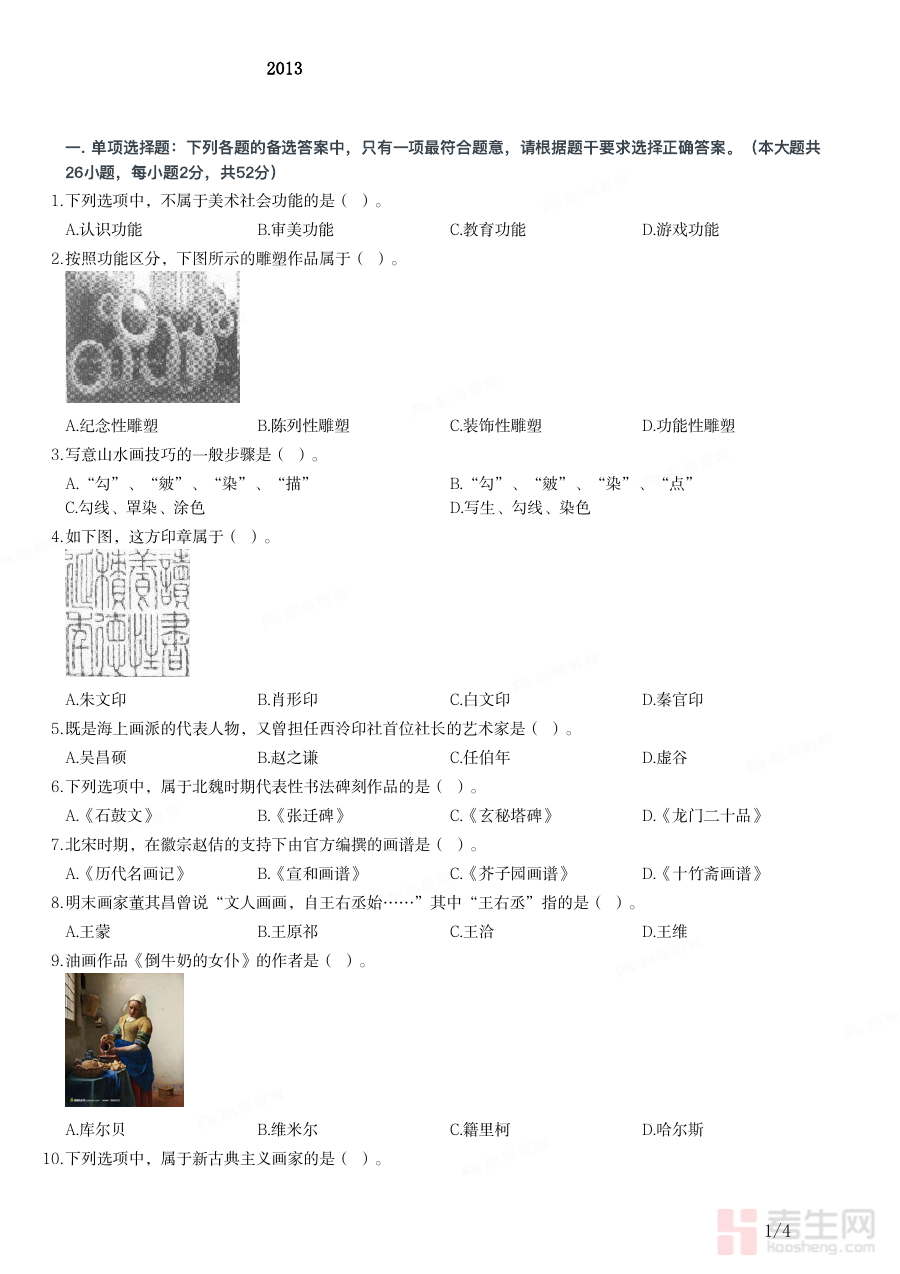 《2013年上半年教师资格证考试《初中美术》题》是2013年上半年针对初中美术学科的教师资格证考试所编制的相关资料,属于全国教师资格证考试体系下的学科备考资源范畴,能够为考生提供对应考试阶段的内容参考,助力考生了解该次考试的相关信息与要求。