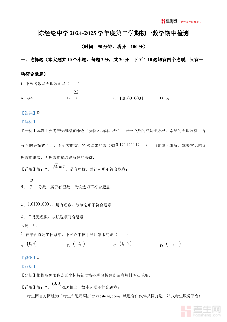 《精品解析:北京市陈经纶中学2024—2025学年下学期七年级期中数学试题(解析版)》是针对北京市陈经纶中学2024至2025学年下学期七年级期中数学考试打造的专业解析资料,精准对应该校该阶段的数学期中考查需求,为使用者提供与本次考试直接相关的备考支持,助力其快速把握考试的核心方向与考查重点。