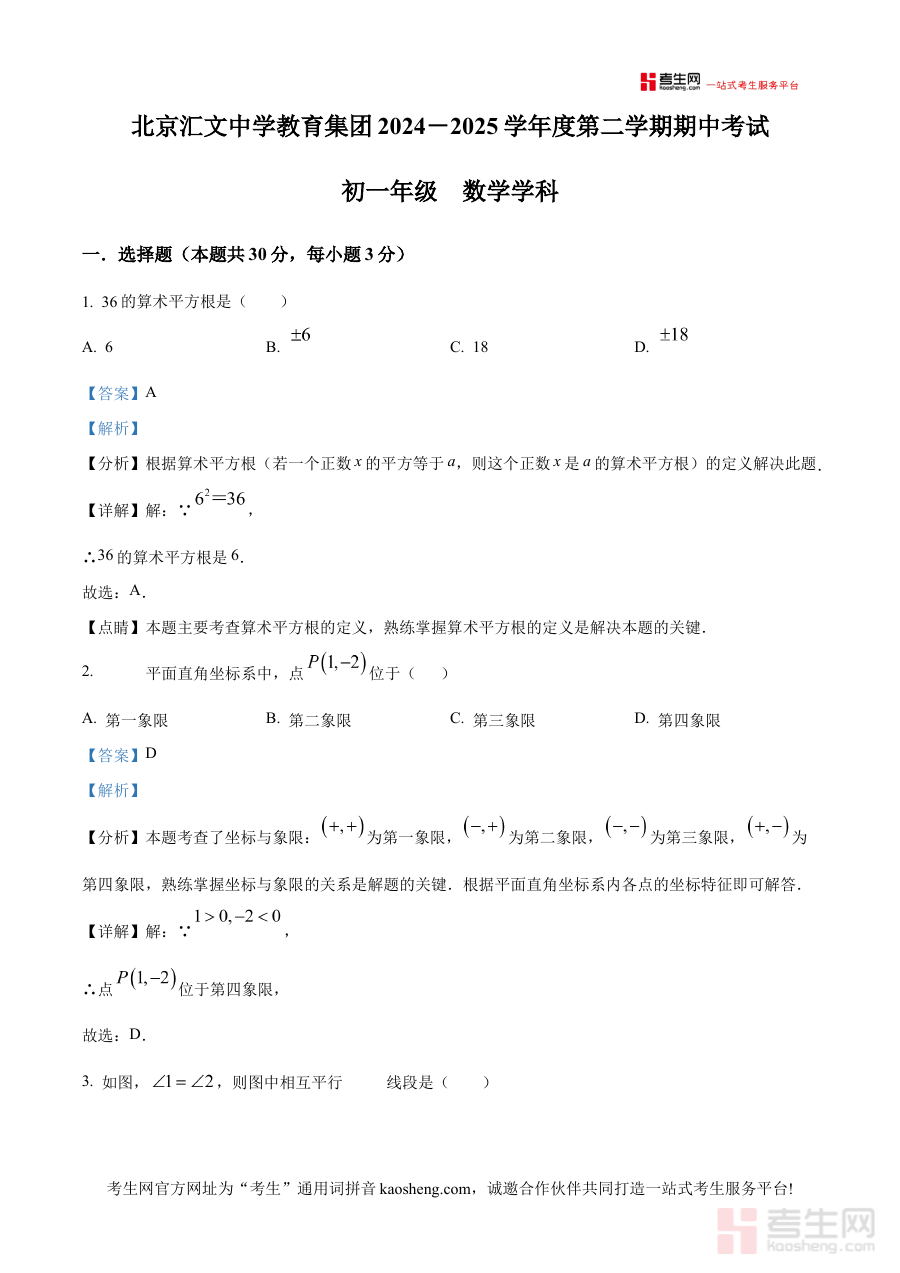 《精品解析:北京汇文中学教育集团2024-2025学年下学期 期中考试七年级 数学试题(解析版)》是针对北京汇文中学教育集团2024-2025学年下学期七年级数学期中考试的专业备考资料,精准对应该集团在本学年中期组织的数学学科检测,明确了考试的时间范围、参与主体、年级学科及考试阶段,整合了与该期中检测直接相关的核心参考信息,为师生备考提供直接且专业的支持。