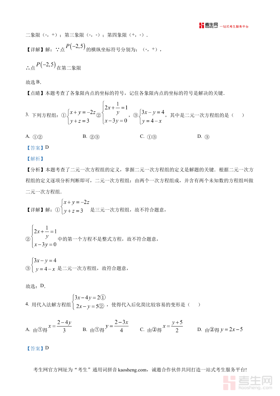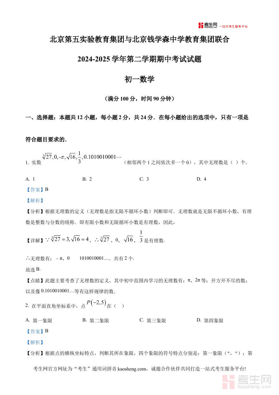 《精品解析:北京第五实验教育集团与北京钱学森中学教育集团联合 2024-2025学年下学期期中考试七年级数学试题(解析版)》是针对北京地区两所教育集团联合组织的2024-2025学年下学期七年级数学期中考试的专业备考资料,整合了两校联合命题的考试内容及对应解析,为相关学生提供针对性的复习支持。