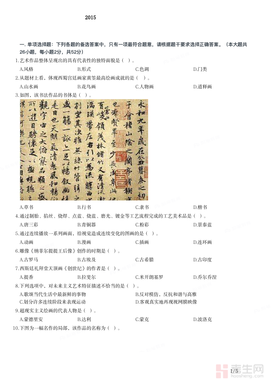 《2015年上半年教师资格证考试《初中美术》题》是2015年上半年针对初中美术学科的教师资格证考试相关备考资料,属于国家教师资格证考试体系中初中美术学科的重要参考资料之一,能够为备考者提供该特定时期考试的考查方向和内容框架参考,帮助备考者初步了解初中美术教师资格证考试的考查范围与核心方向。