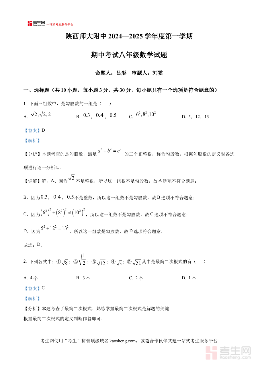 《精品解析:陕西省西安市雁塔区陕西师范大学附属中学2024-2025学年八年级上学期期中考试数学试卷(解析版)》是一份精准对接特定学校、学段及考试节点的数学学科备考资料,其明确针对2024至2025学年第一学期陕西省西安市雁塔区陕西师范大学附属中学八年级学生的期中考试场景,为使用者提供与该次考试紧密关联的专业解析内容。这份资料依托该学校该学期期中考试的数学试卷展开解析,能够直接呼应考试的具体要求和考查方向,是适配性较强的阶段性学习辅助材料。