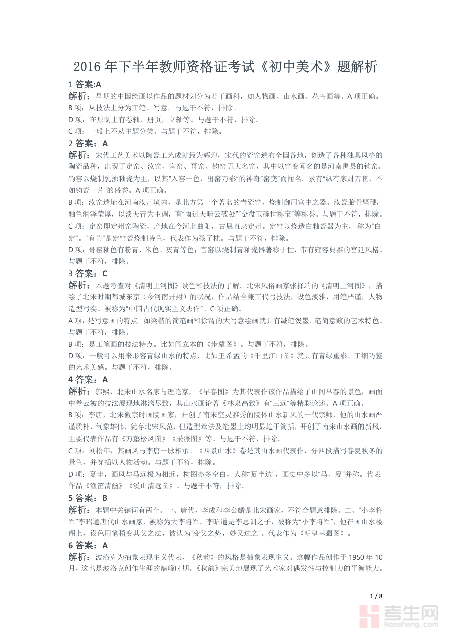 《2016年下半年教师资格证考试《初中美术》题解析》是针对2016年下半年全国教师资格证考试初中美术科目的专业备考资料,聚焦该次考试的试题内容展开系统解析。作为教师资格证考试备考体系中的关键资源,它能够为备考者提供与该次考试直接相关的专业分析支持,帮助考生快速对接考试的核心要求与考察方向,为后续精准高效的备考奠定坚实基础。
