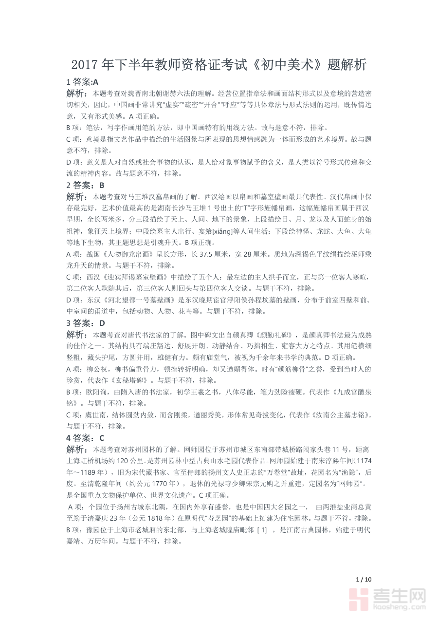 《2017年下半年教师资格证考试《初中美术》题解析》是2017年下半年针对初中美术学科的教师资格证考试备考资料,与该次考试的学科范围和命题要求高度契合,聚焦初中美术教资考试的核心内容方向,为备考者提供该次考试相关题目的专业解析服务,帮助备考者快速建立对考试内容的认知框架。