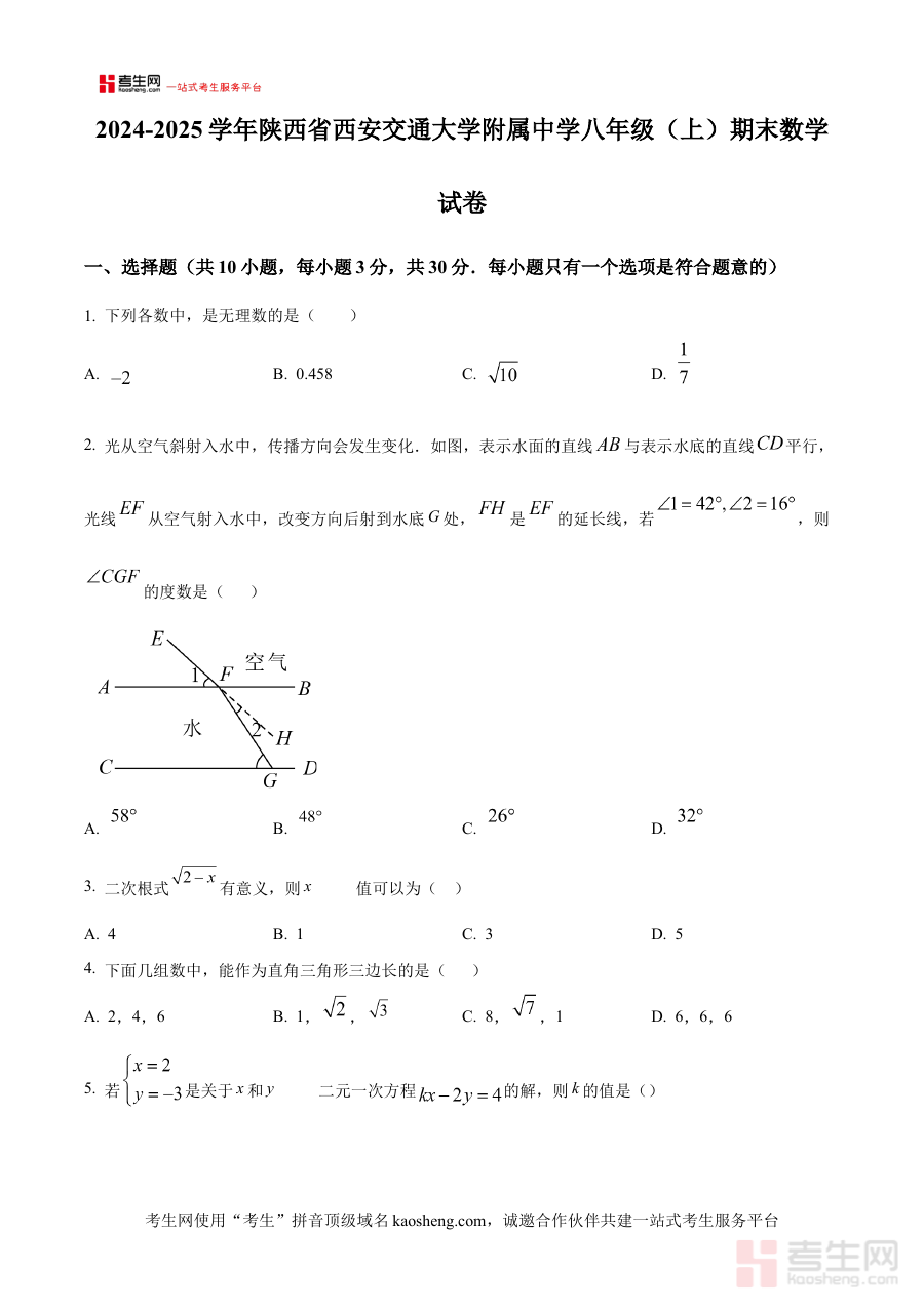 该资料适用于2024-2025学年西安交通大学附属中学的八年级学生,同时也适用于其他同类中学的八年级学生及相关数学教师、学生家长。对于学生,它能帮助提前熟悉期末数学考试的形式与要求,提升备考针对性;对于教师和家长,它是了解学校期末考核标准、优化备考方案的重要依据,有助于推动学生高效复习,在期末数学考试中取得良好成绩。
