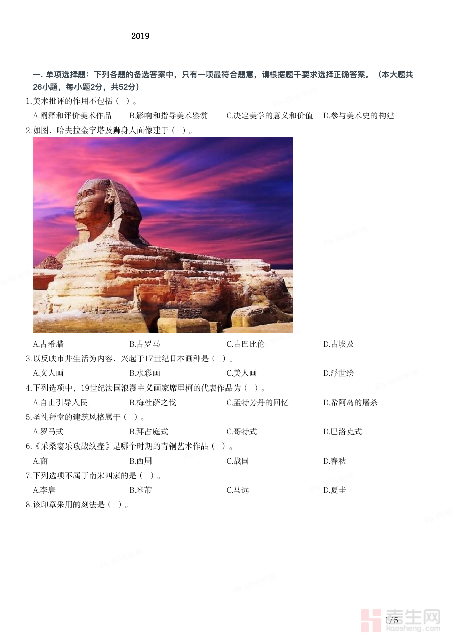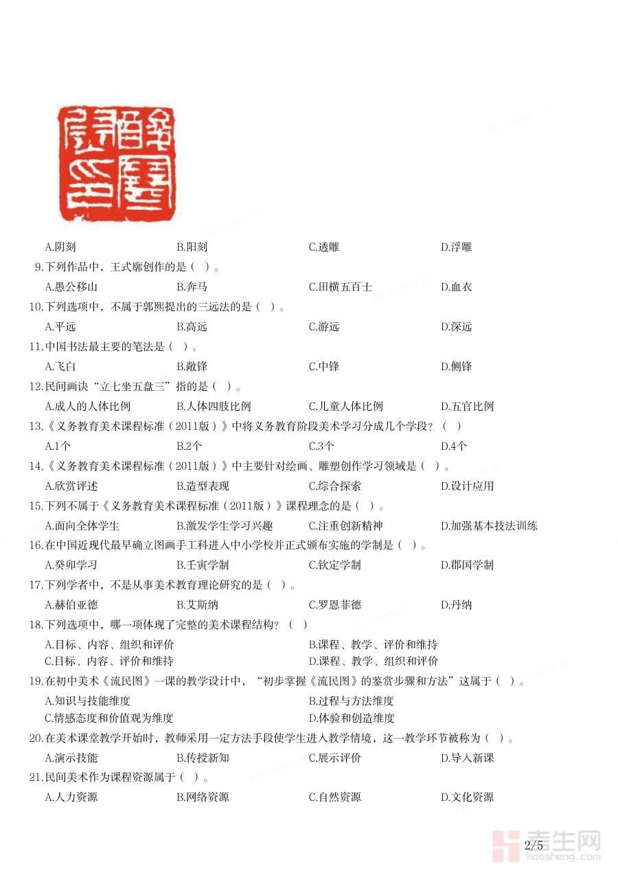 《2019年下半年教师资格证考试《初中美术》题》是针对2019年下半年全国教师资格证初中美术学科考试编制的备考资料,紧密契合该次考试的学科考查框架与方向,为备考者提供了与实际考试场景高度匹配的练习素材,助力备考者熟悉考试模式及初中美术学科的核心考查要点,是备考过程中不可或缺的参考资料之一。