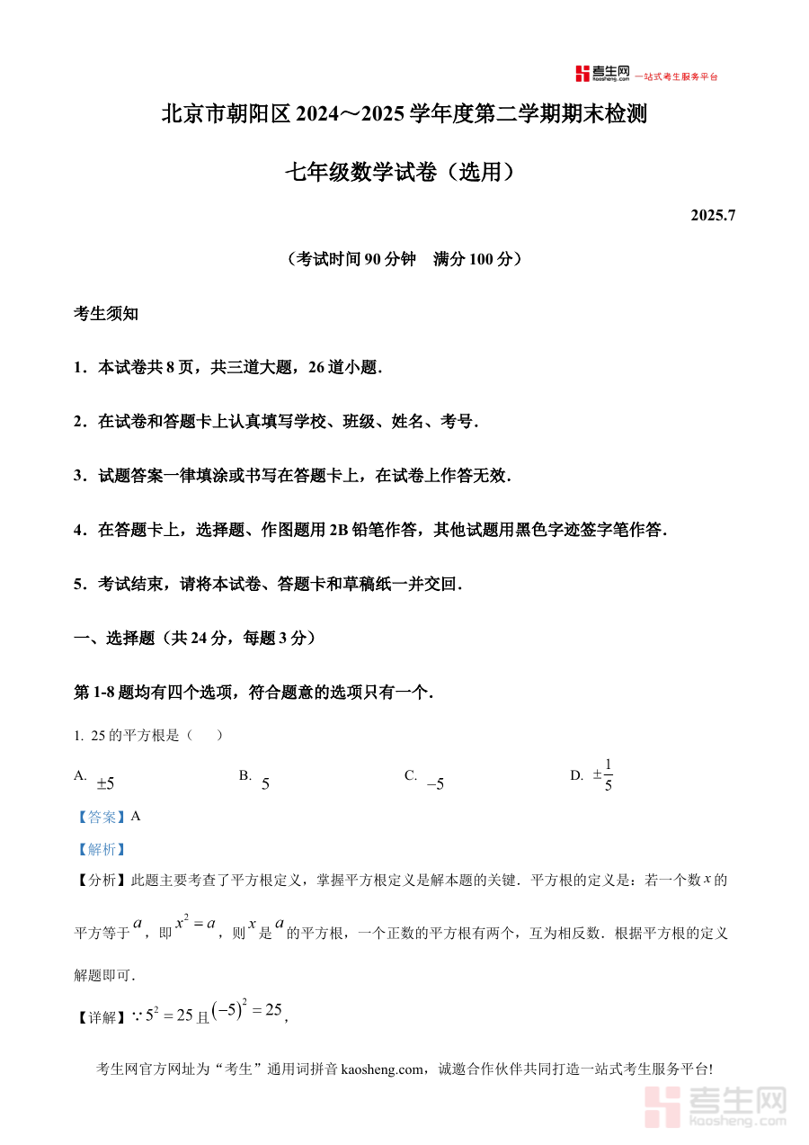 《精品解析:北京市朝阳区2024-2025学年七年级下学期数学期末试题(解析版)》是针对北京市朝阳区2024-2025学年七年级下学期数学期末这一特定考试的配套备考资料。它明确了考试的时间范围、地域范围、学段及学科属性,为相关使用者提供了精准的考试内容参考方向。作为解析版资料,它不仅包含试题本身,还附带了对试题的详细解读与分析,有助于使用者把握考试的考查重点与命题趋势。