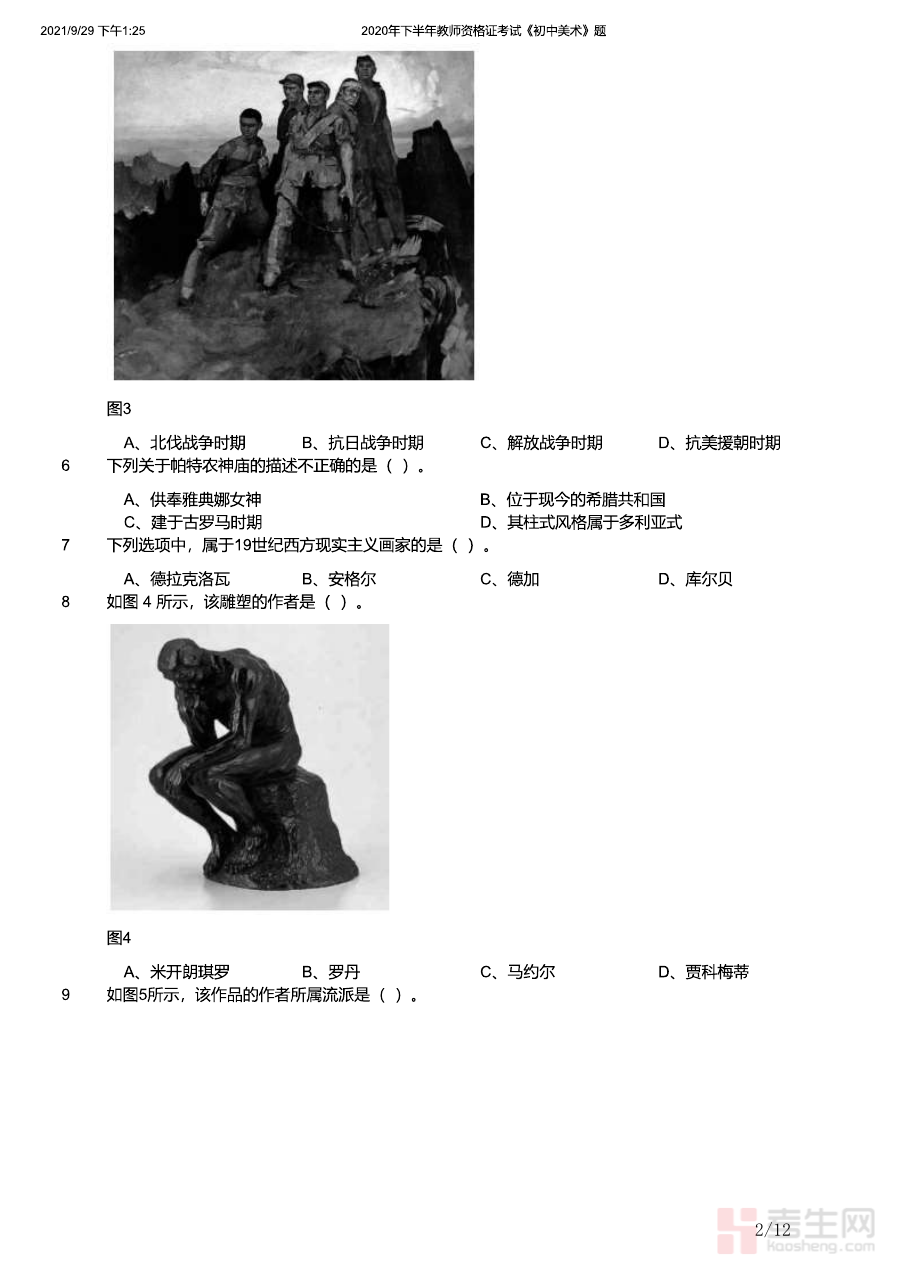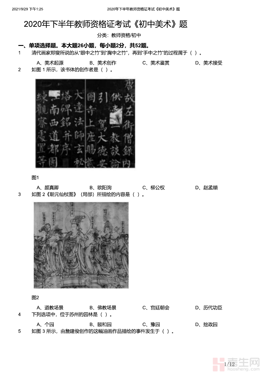《2020年下半年教师资格证考试《初中美术》题》是针对2020年下半年全国教师资格证统一考试初中美术学科的专业备考资料,贴合当次考试的时间节点与学科考查方向,为考生提供与考试实际场景相匹配的练习素材,助力考生熟悉考试的整体框架与学科考查的核心维度,是备考过程中不可或缺的重要资源之一。