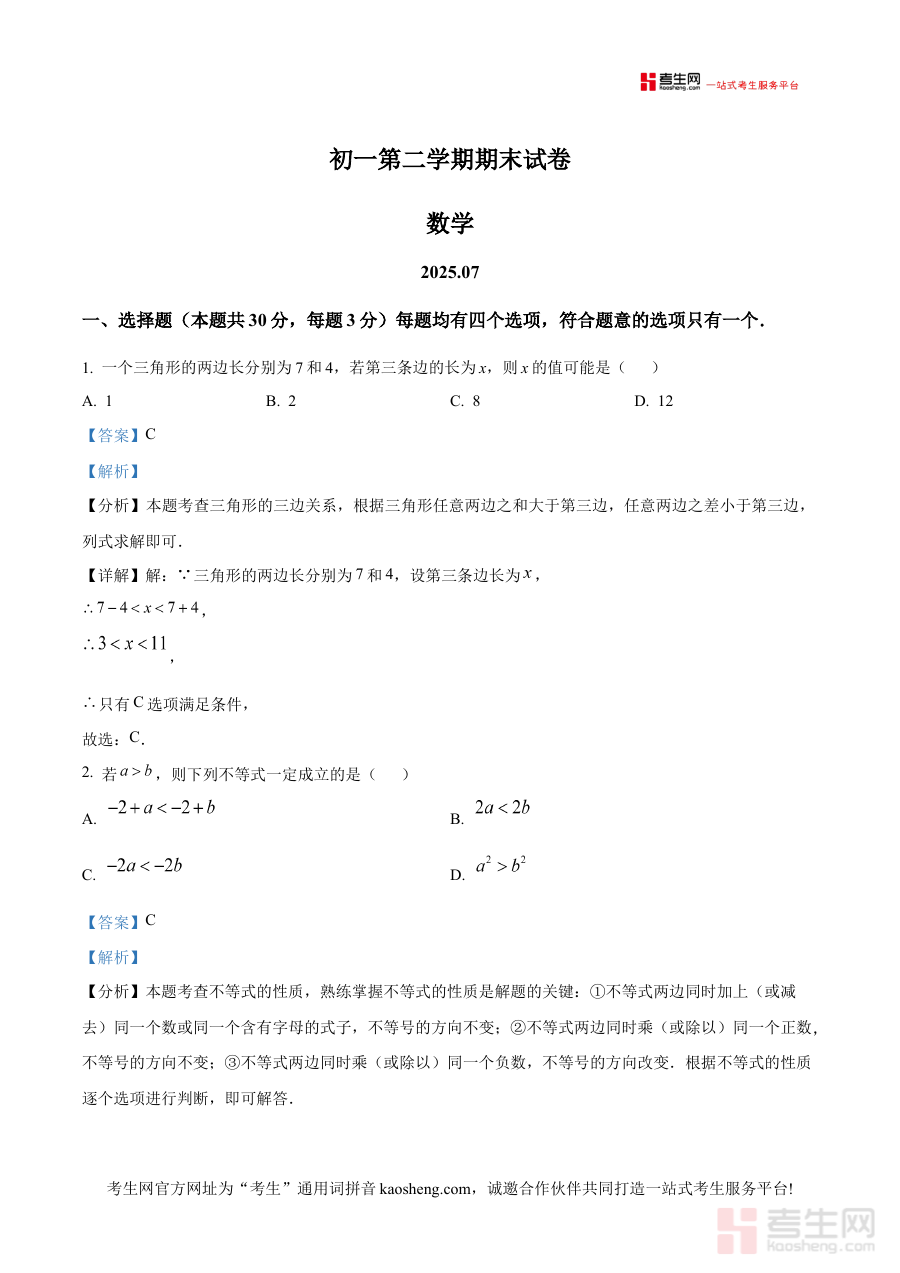 《精品解析:北京市海淀区清华大学附属中学2024-2025学年七年级下学期期末数学试题(解析版)》是针对北京市海淀区清华大学附属中学2024-2025学年七年级下学期期末数学考试的备考资料,结合该地区及学校的教学特点与考试要求编制,为学生提供精准的备考支持。